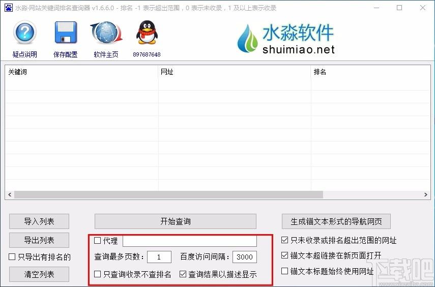 水淼网站关键词排名查询器是一款非常简单且实用的网站关键词排名查询工具,如果您需要查询网址的百度收录和关键词排名,就可以使用到这款软件,从整体来看,软件的操作还是很简单的,只需导入网址和关键词,设置相应的查询选项,一键即可进行查询,通过相关精准的查询算法快速且准确的显示查询结果,包括关键词、网址和排名,便于您直接了解网站的百度收录情况以及网站关键词排名情况,支持将查询结果以描述进行显示,总之这是一款非常好用的软件,如果您有需要,那就赶快下载体验一下吧!